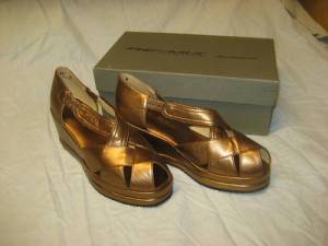 Also spotted, but not for the dance floor, a pair of Remix “Gilda” platform wedges in bronze, size 7, new in box!