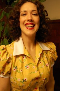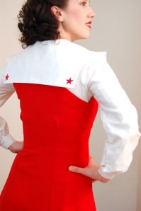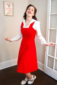 I love the initiative and creativity of those seamstresses and tailors who take vintage patterns and make them come alive again. Etsy seller Jitterbuggin is one of these talented people who create garments of the past in the present, and adds her own bit of whimsy through her pattern and fabric selections.