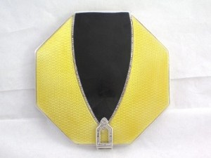 A quick Google search for “art deco compact” yielded a hit for Kyle Designs, which has a custom Art Deco-inspired compact for $25.00. Customization includes selecting the metal, the color plate, and for a few dollars more you can have the compact engraved. I think this would make a great gift for the ladies, gents. *wink, wink, nudge, nudge*