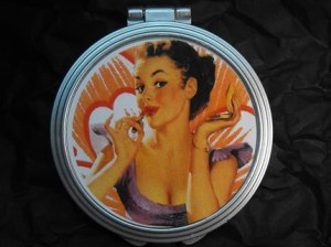 I also browsed through Etsy and found ByMIMI, who embellishes her compacts with bits of filligree, vintage jewelry, and some whimsy. Finally, dnacreations on Etsy offered a number of pin-up girl compacts at the low price of $4.00. I’ve posted some samples from these two sellers below, as well.