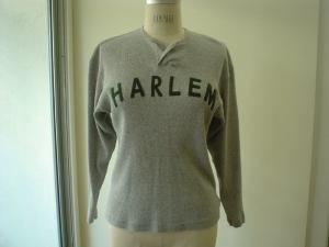 Shortly after I heard about the musicians v. dancers baseball game at the Ultimate Lindy Hop Showdown in New Orleans, I serendipitously ran across this reproduction baseball henley on eBay, apparently a replica from 1930’s and 40’s baseball leagues. If Lindy Hoppers were to form a team, wouldn’t Harlem be home? Go Harlem!
