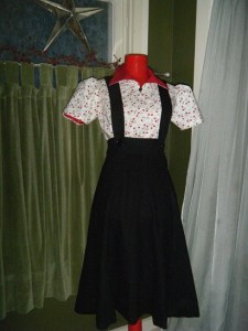 The jumper and blouse were made to fit a modern size 6-8. The waist on the skirt is approximately 27 inches, but might fit a 28, as there’s some room to move the fasteners over. The amount of space in the hip area is generous and will drape nicely to fit. The blouse will fit up to a 36C bust and around a 34 bust, with the waist in the blouse being more generous than the skirt. If you have any questions about measurements, please let me know and I’ll be happy to measure the garments. The outfit looks even more adorable in person, I’d bid on it myself if it was my size. I love the contrast collar, the big buttons on the jumper, and that the jumper straps cross in the back. The jumper has 8 gores in the skirt, which means maximum twirly-ness and dreaminess!