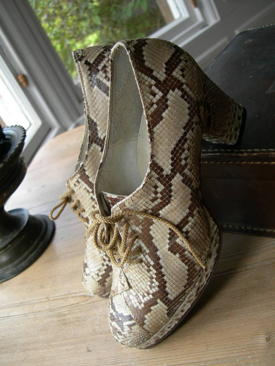 Ever since my grandmother told me about dancing a hole through the sole of her red snakeskin pumps in one night of dancing during WWII, I have been pining for a pair of my own. While these are neither pumps nor red in color, this pair of snakeskin (or “python” as the seller lists) 1930’s oxfords is a pretty awesome curiosity (although, with the slight platform, would you place them as 1940’s?). The condition is remarkable and so is the pattern and the way the pattern is placed on the shoe.