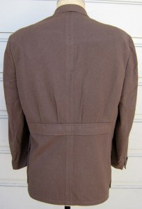 “Original Men’s 1930’s two piece BACK BELT SUIT in Size 42” chest in a nice medium cocoa brown wool flannel suiting. The jacket is single breasted with two lower patch pockets and decorative seams down the front. The back is pleated into a half belt and has a “Bi-Swing” action back with two long vertical pleats. The pants have a pleated front and two side and two back pockets. The only markings are an ink stamp on the trouser waistband: “Paramount Wardrobe”