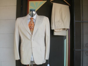 While fall is upon us, I couldn’t help posting this fantastic 30’s/40’s belt back summer weight suit, size 40 jacket with a 33 inch waist in the pants. Man, this suit looks great – I had hoped it would fit my husband, but there’s less than an inch to let out in the pants. Now that I’m not hoarding it, someone else should pick it up. š