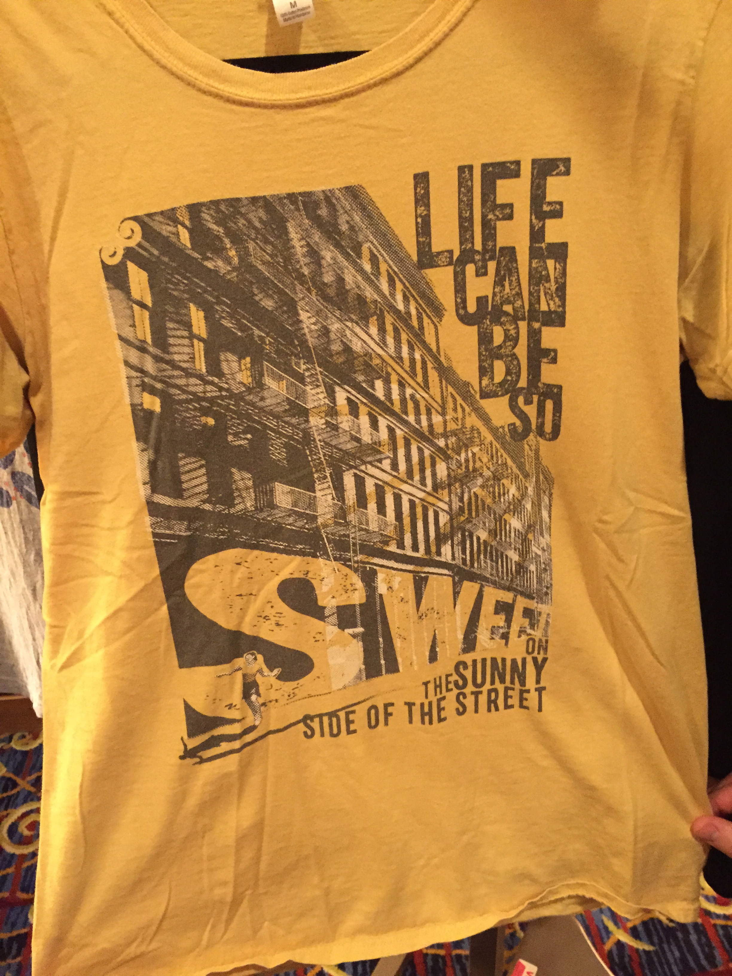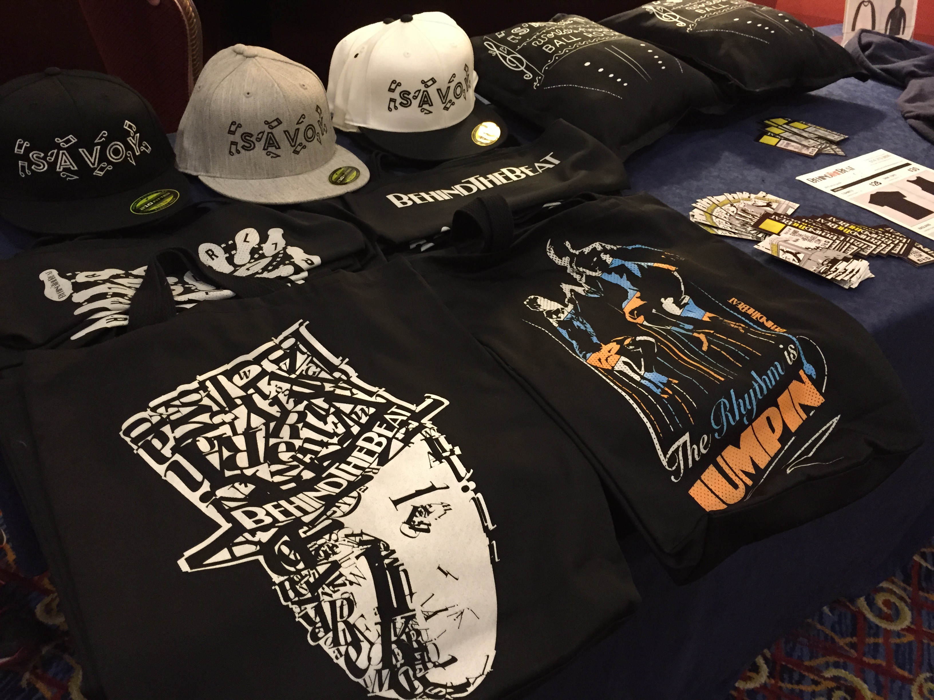 Last, but certainly not least, the largest display at ILHC was from Behind the Beat Apparel, with a full range of tees, hoodies, hats, and bags with clever Lindy Hop and jazz-themed screen prints. I have two items of particular note: