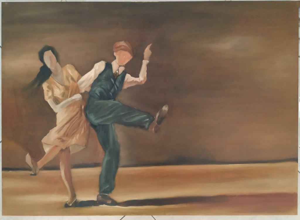 Emily Ensign’s “Swing Follow Pink Dress” oil painting pays tribute to the roots of Lindy Hop with a nod to Degas’ ballerinas