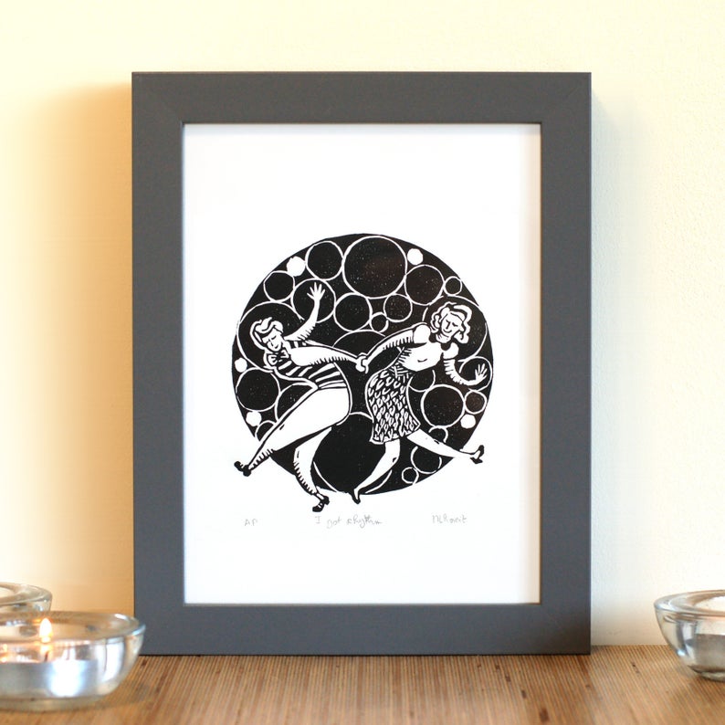 As we embark on this rather abbreviated holiday season, we have even less time to get our act together and buy thoughtful gifts for the swing dancers in our lives.  Here are some tidbits and links that may help you out, but also, gift cards for retailers that sell dance shoes are always at the top of my want list!  I’m highlighting visual artists this year because there is so much fun art being created, inspired by our dance art.