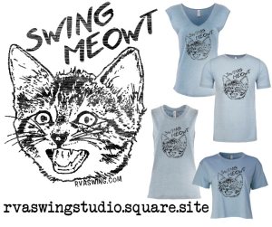 If you’ve ever been to I Heart Bal or if you know Richmond-based instructor Erica Vess, you know what an incredible artist she is and how she is able to hone in on the most adorable and instantly relatable ideas and translate them into marketing and merchandise for her event. I have only been to half of the I Heart Bal events, but I buy merchandise every year because I want it, it’s so good. I was delighted to see a one-off design this morning from Erica in my Facebook feed, featuring a punk rock kitty with punk rock font saying SWING MEOWT. This appeals to every fiber of my being.