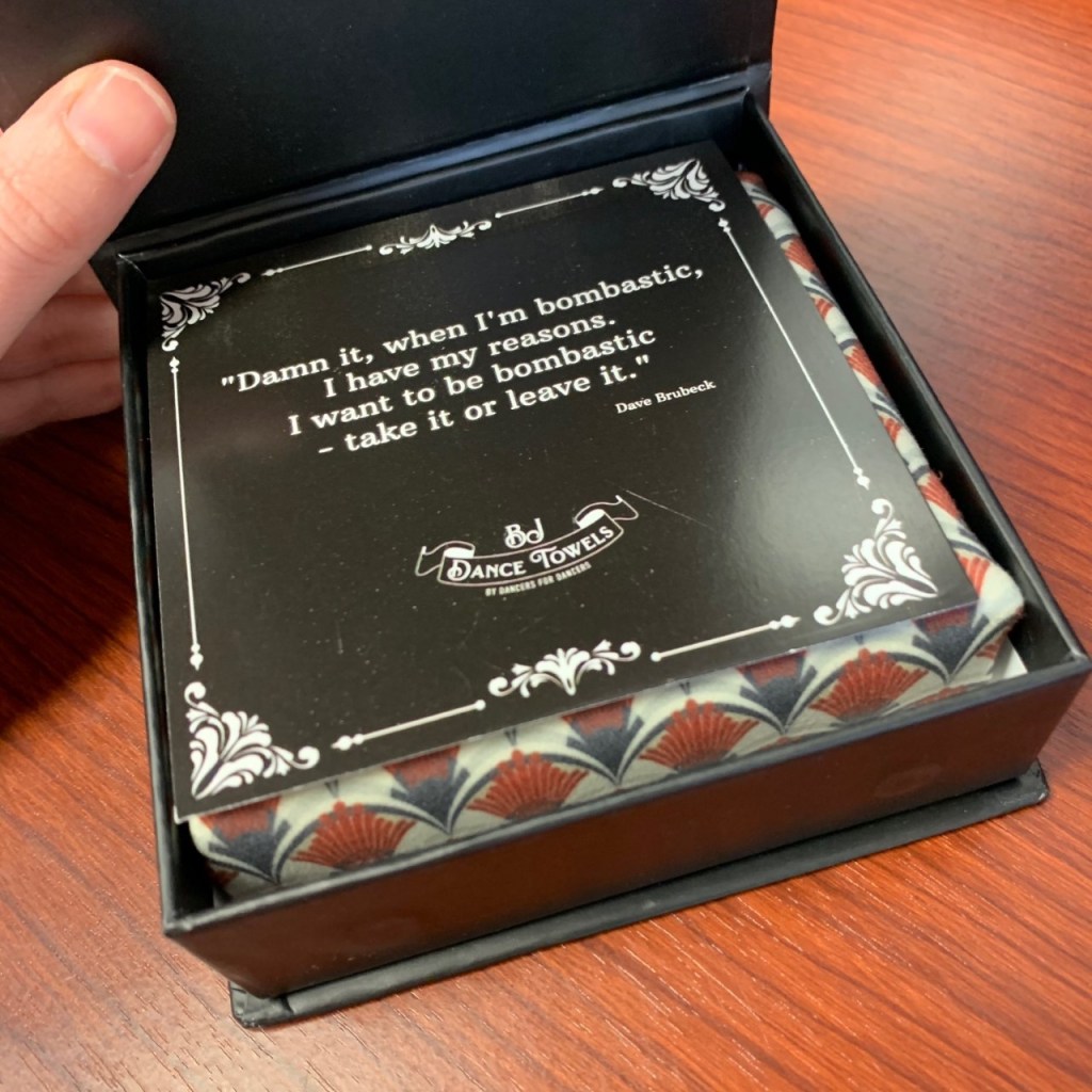 Let’s walk through the receipt of my Savoy dance towel. I opened the package from Germany to find a well-crafted box with the BJ Dance Towels logo and some lovely design work. I am immediately smitten and thinking that this box will be great for traveling, either to carry jewelry or flat hair flowers.