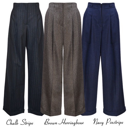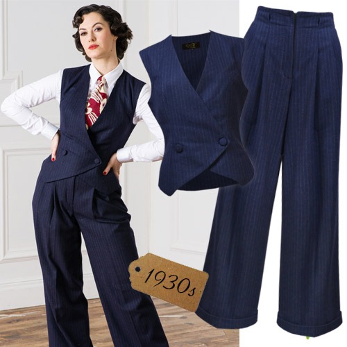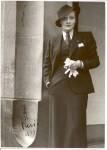 My favorite brand of the moment, the UK-based House of Foxy, has released three sets of trousers and waistcoat pairings inspired by Dietrich, complete with men’s style tailored trousers, in navy chalk stripe, charcoal chalk stripe, and brown herringbone. Women’s trousers, still rare during the 1930’s, would likely have had a side opening instead of a front opening, but Dietrich was known for having men’s pieces tailored for her, so the House of Foxy trousers follow suit. I’m so very excited about these pieces, primarily because I’ve had women approach me about how to get this look or ask where to find menswear to fit women’s bodies, and, short of replicating Dietrich’s strategy of paying a tailor to modify menswear, my recommendations often fell short. Baby steps…also, the charcoal stripe vest (as of my writing this) is still not posted on the website and I’ve been hitting refresh for two weeks eagerly waiting for its release to purchase along with the trousers – I have ties, braces, a cap, and cap-toe boots ready to go! *REFRESH*