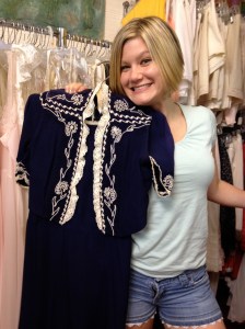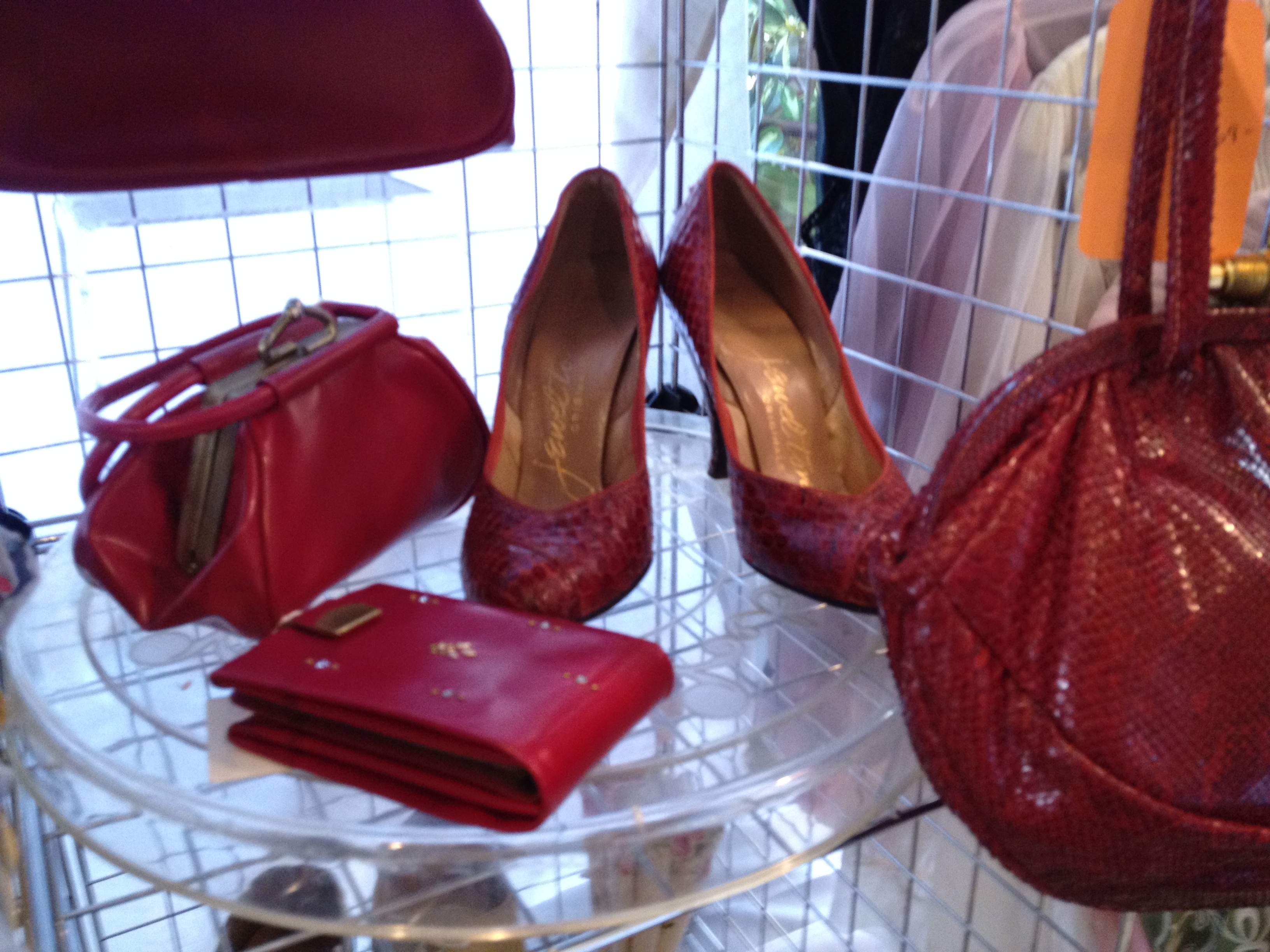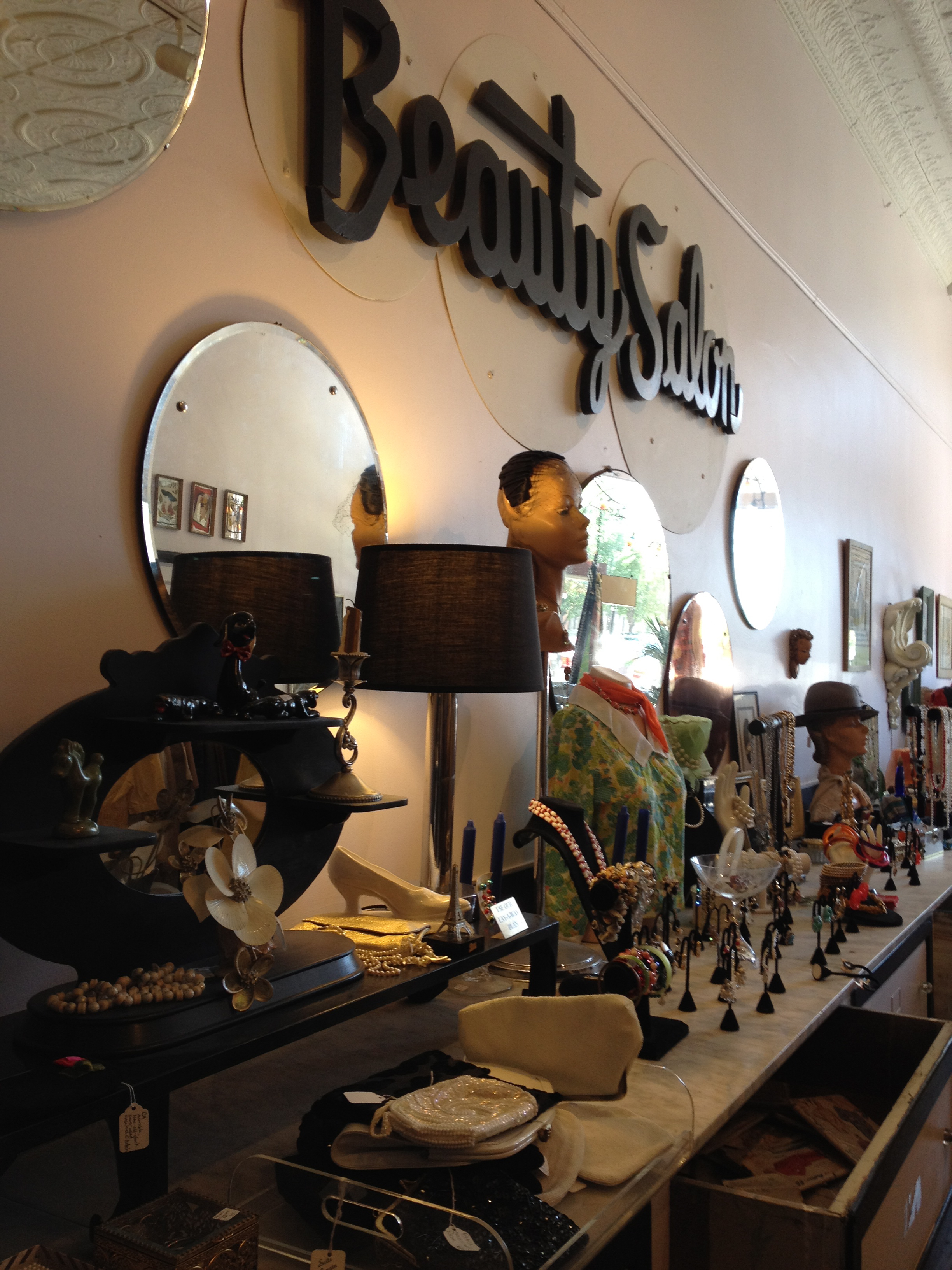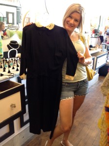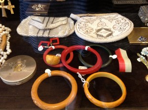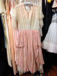 Flower Child took up about half the hallway, with a wonderful display that moved from housewares and accessories, to jewelry, to several large racks of clothing at the end of the hall. Because Flower Child is made up of several vendors, there were a range of prices in the shop, and they definitely had the larges selection. Favorites included a 1940’s gold bathing suit, rayon Asian print pajamas, and an adorable dress with strawberry ribbon trim that came home with me.