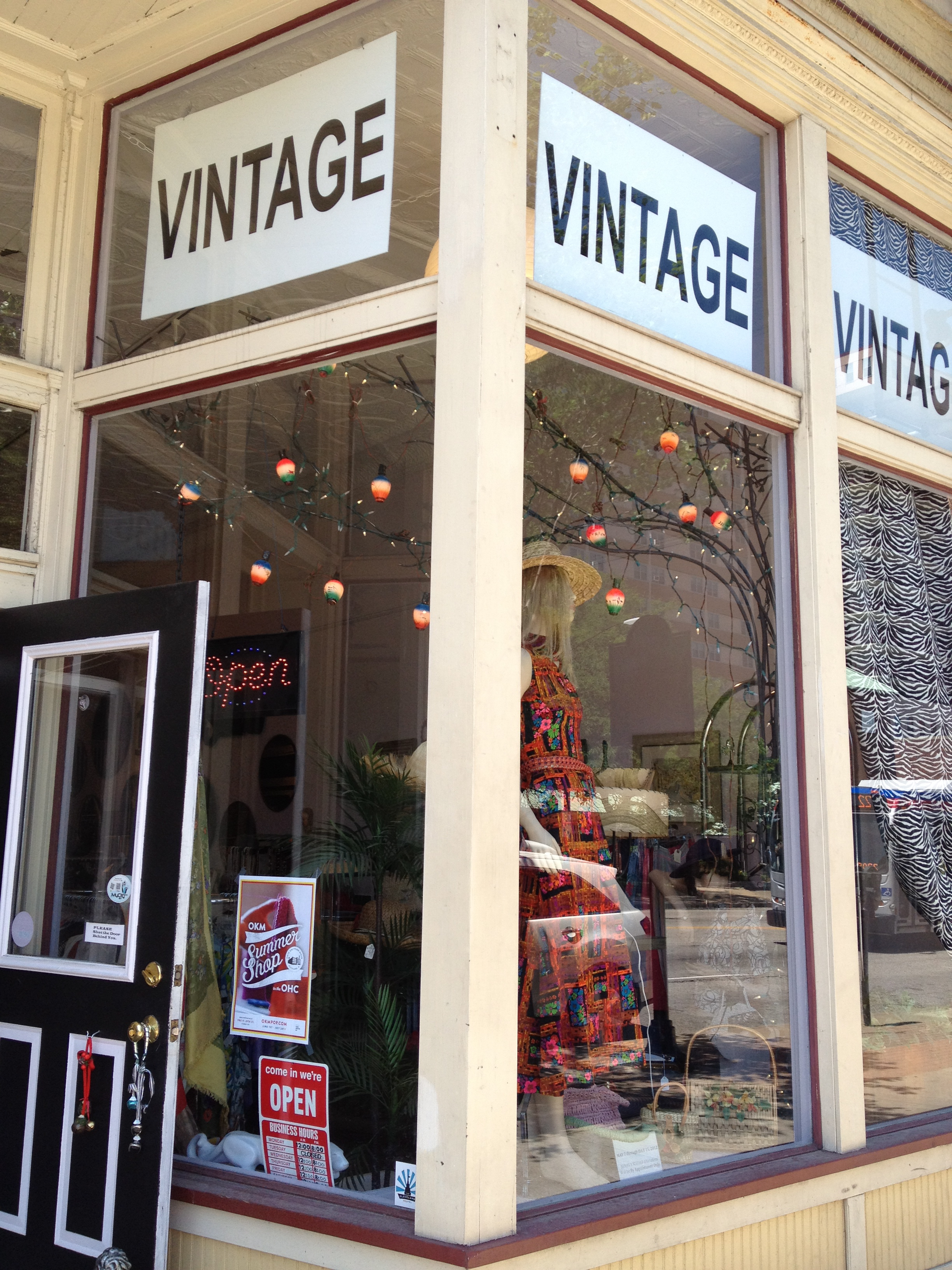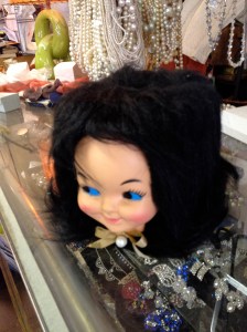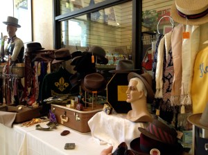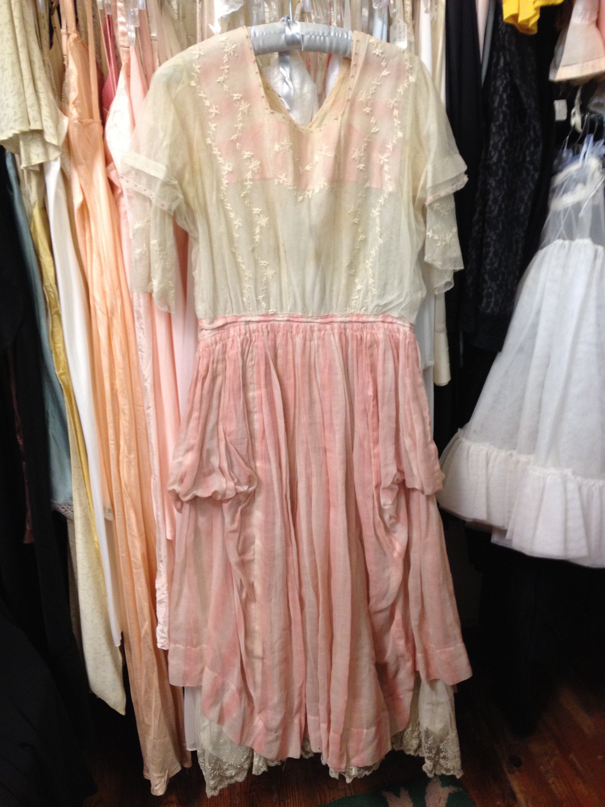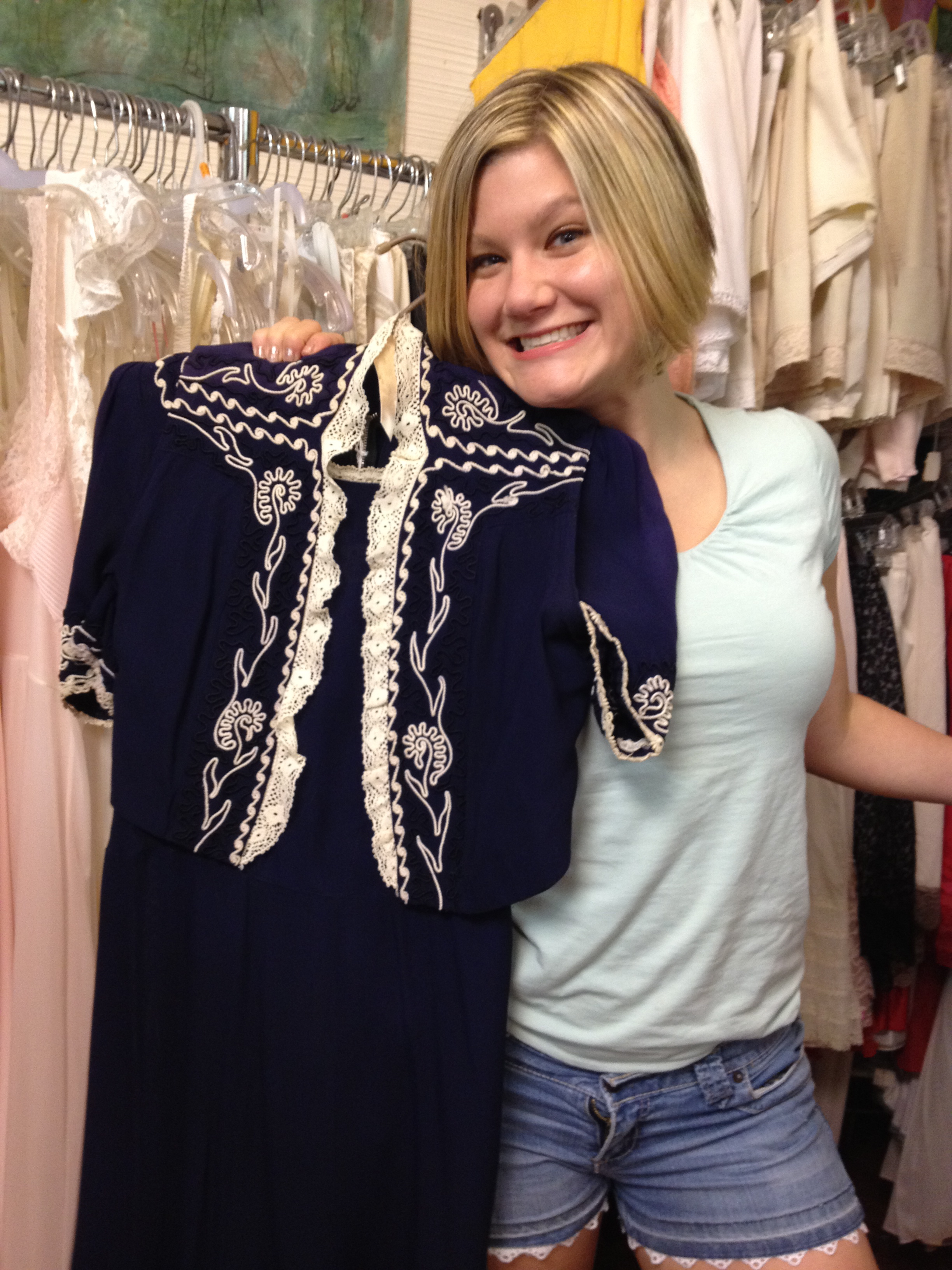 Flower Child took up about half the hallway, with a wonderful display that moved from housewares and accessories, to jewelry, to several large racks of clothing at the end of the hall. Because Flower Child is made up of several vendors, there were a range of prices in the shop, and they definitely had the larges selection. Favorites included a 1940’s gold bathing suit, rayon Asian print pajamas, and an adorable dress with strawberry ribbon trim that came home with me.