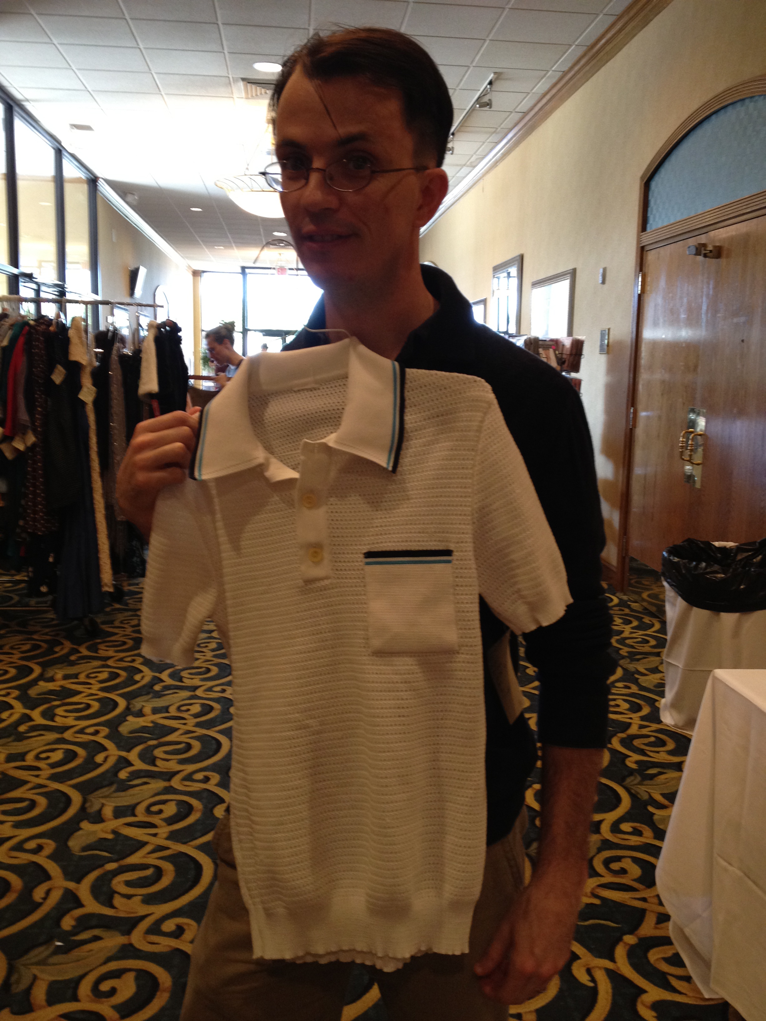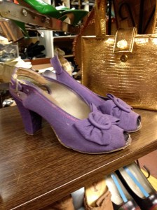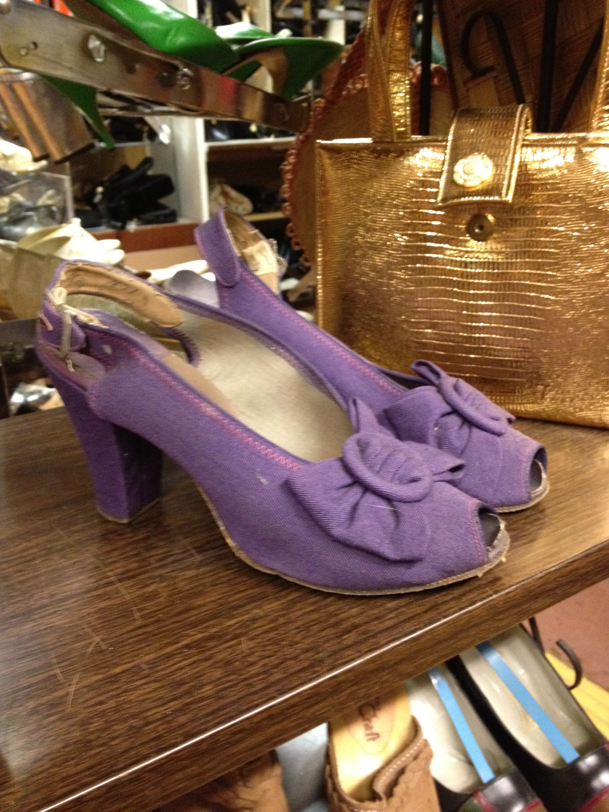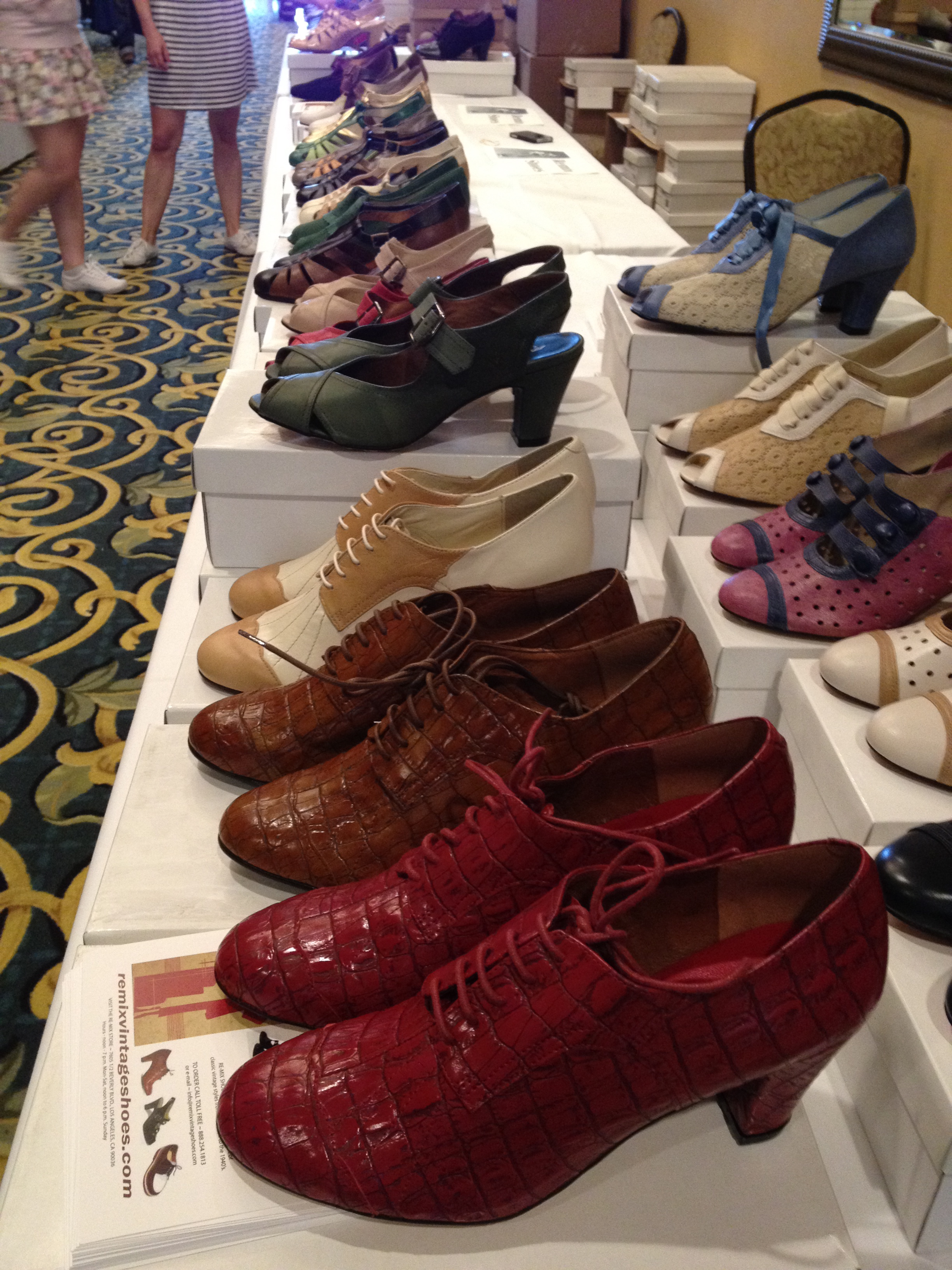 Moving down the hallway, the next vendor was the ever-popular Re-mix Vintage Shoes, with owner Philip Heath on hand to help all the men and women eager to try on their shoes. This year, they took advance requests from people for specific shoes and sizes, so if you wanted a guaranteed shot at trying on a certain pair in your size, you got that chance. I took advantage of this for my husband, who is sort of between sizes and needed another pair of oxfords. It also resulted in Re-mix bringing a number of pairs of wedges, which have never made it out to ABW, since we mostly dance “the Balboa” in heels. 😉
