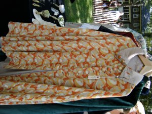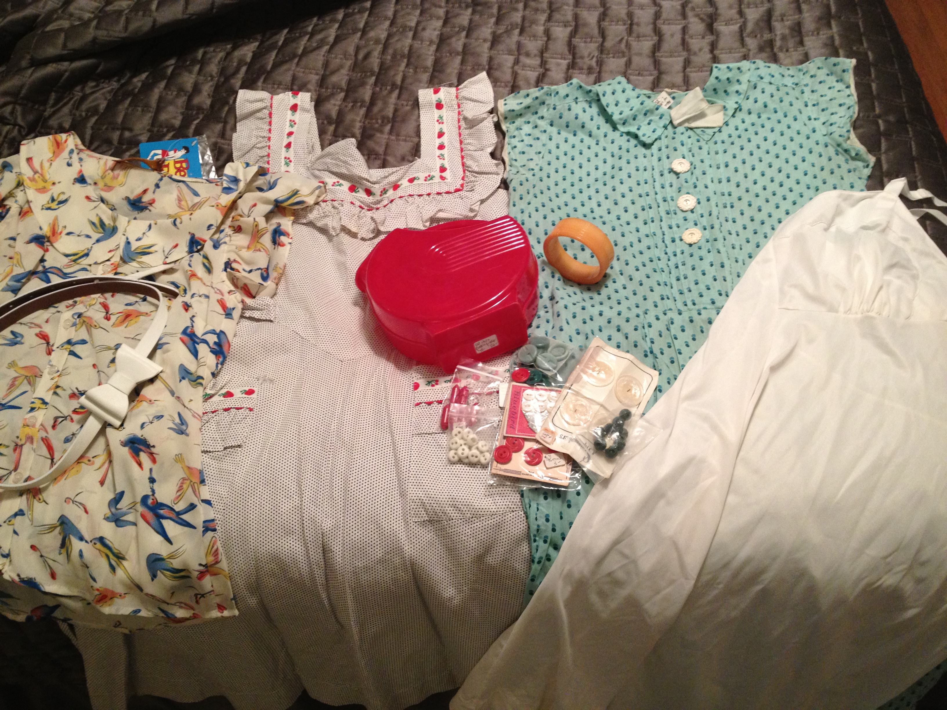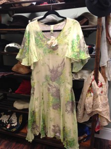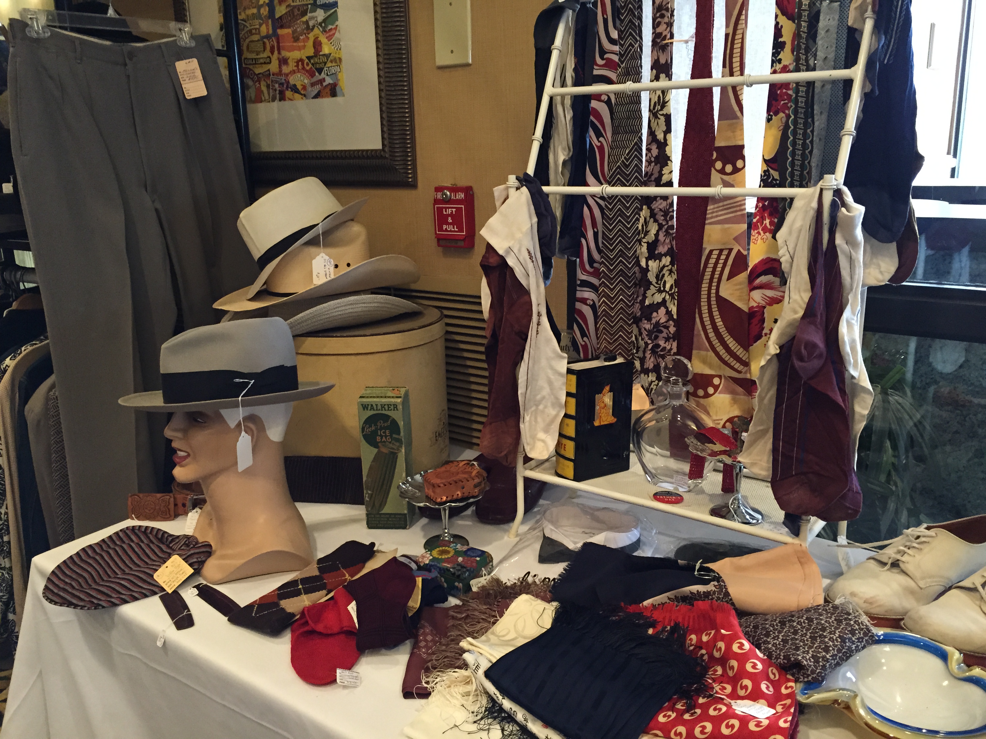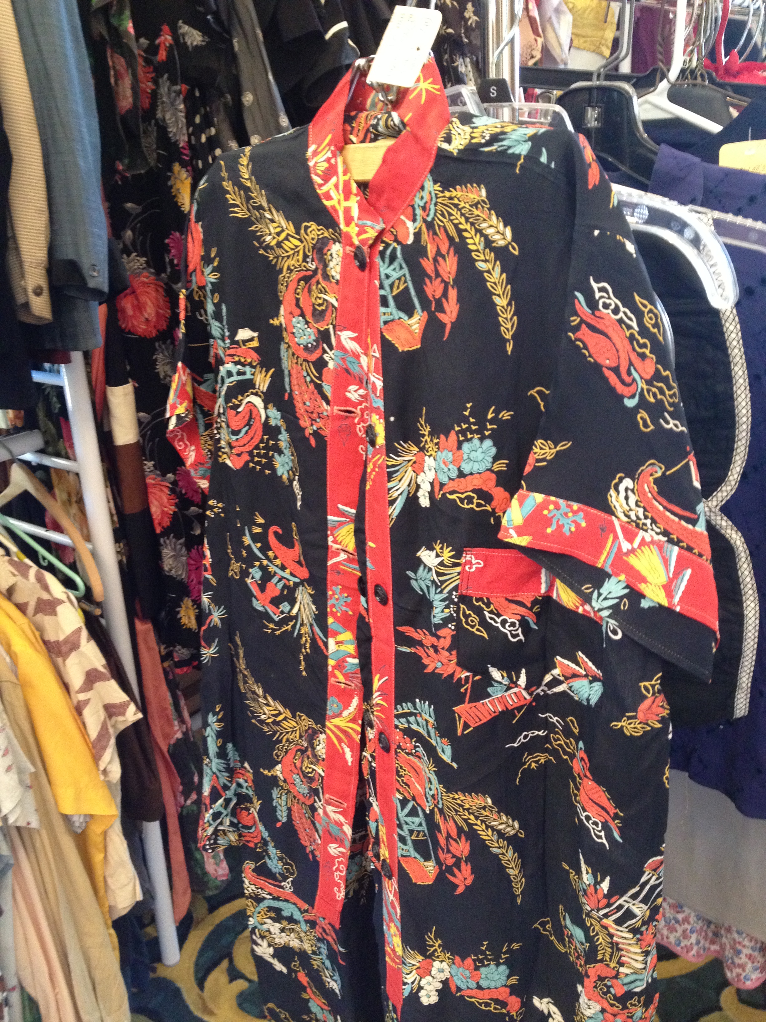 Flower Child took up about half the hallway, with a wonderful display that moved from housewares and accessories, to jewelry, to several large racks of clothing at the end of the hall. Because Flower Child is made up of several vendors, there were a range of prices in the shop, and they definitely had the larges selection. Favorites included a 1940’s gold bathing suit, rayon Asian print pajamas, and an adorable dress with strawberry ribbon trim that came home with me.