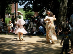 The Jazz Age Lawn Party never ceases to amaze me, with its charm, beauty, number of well-dressed people, and even its power over mother nature. It is such a rare opportunity to dance entirely to 1920’s music and the quality of music was superb, thanks to Michael Arenella’s Dreamland Orchestra, the Gelber and Manning Band, and the twin Victrola turntables operated by DJ MAC. It was a beautiful weekend under the trees on Governor’s Island – the storms that threatened New York were held at bay until Sunday afternoon, when Michael Arenella commented from the bandstand that the rain couldn’t stop the festivities and called a tune with “rain” in the title to mock the threatening weather; it was then that the sky opened up, with only a few warning drops before the downpour sent everyone scurrying for cover.