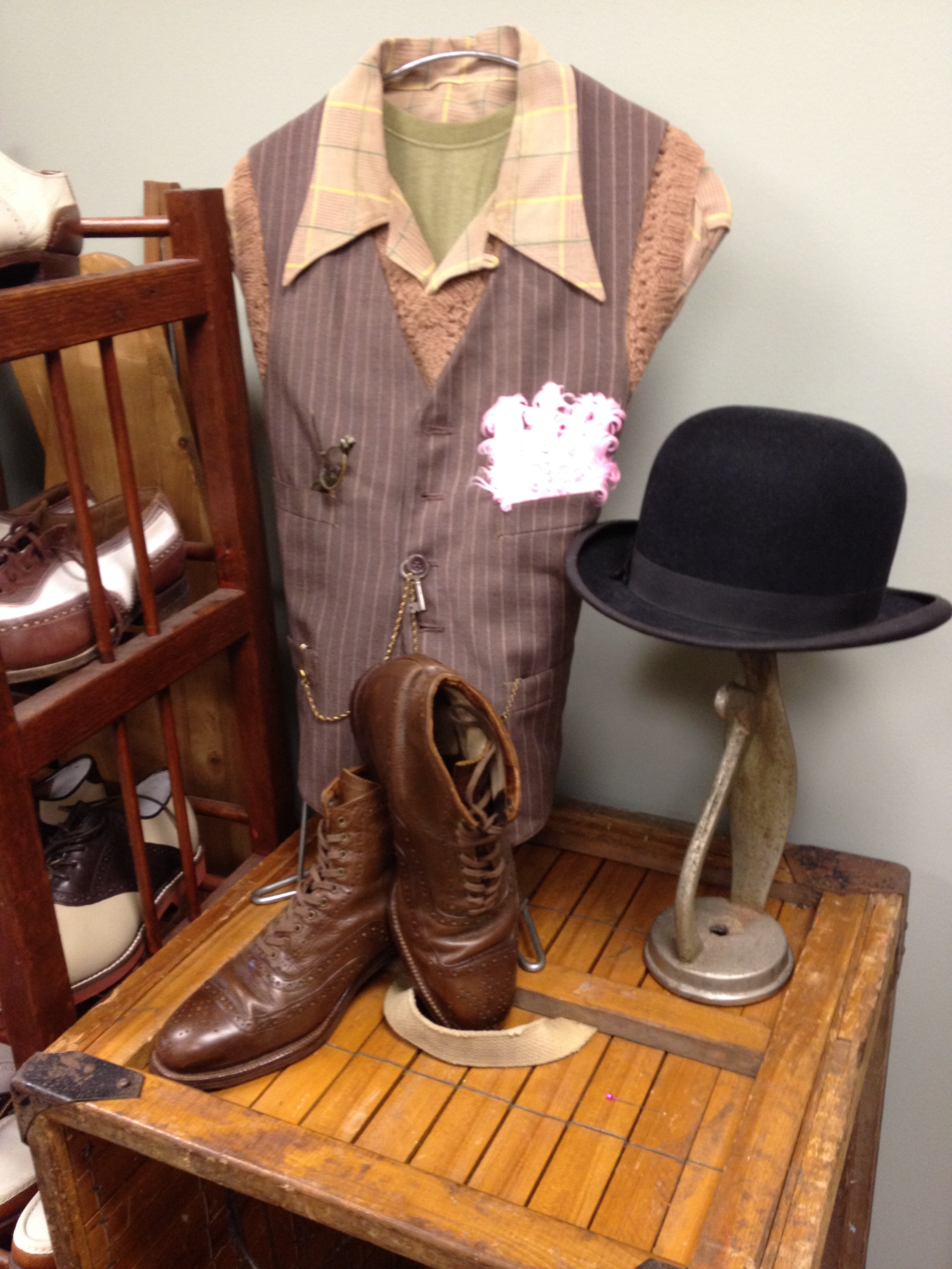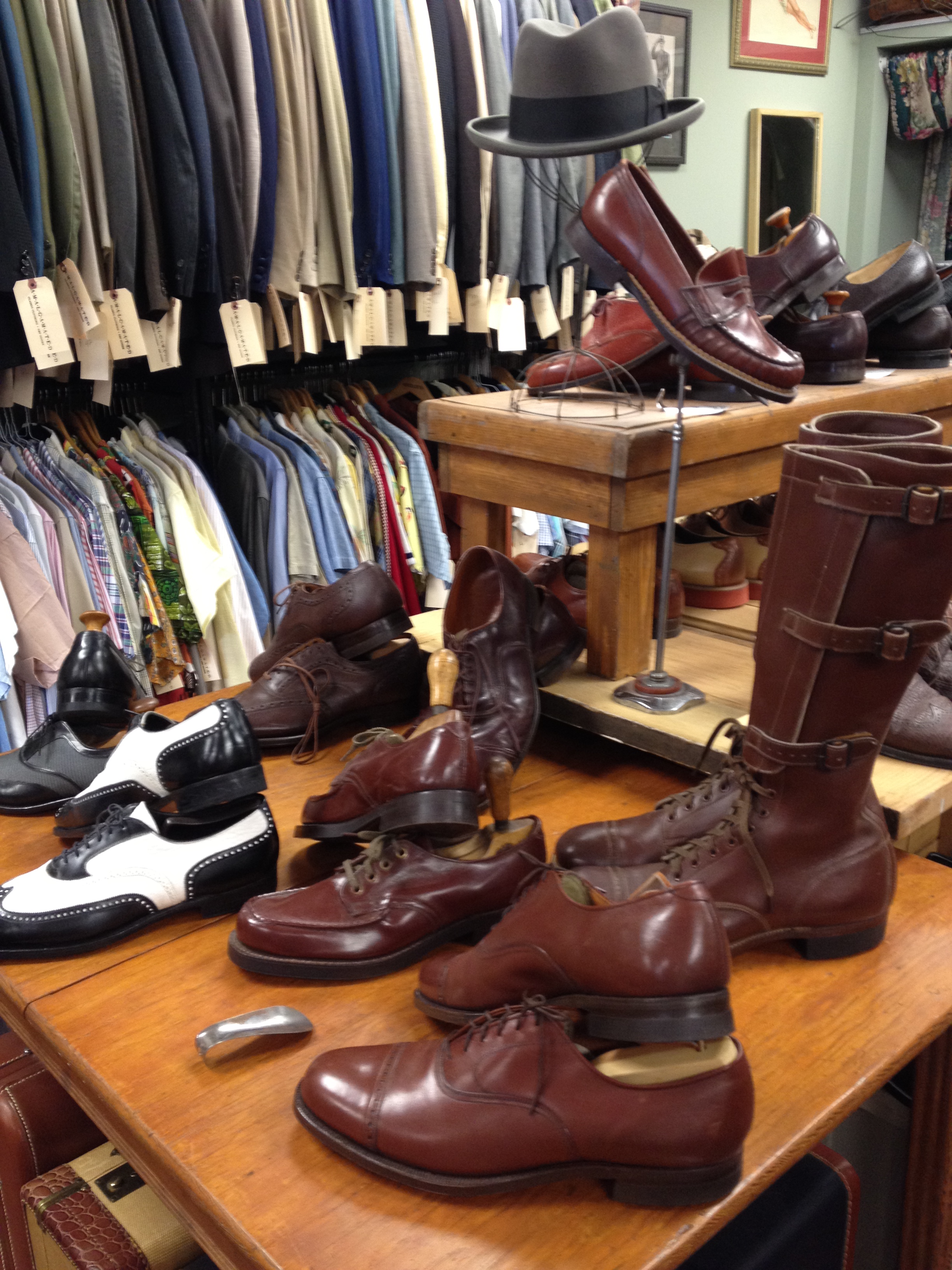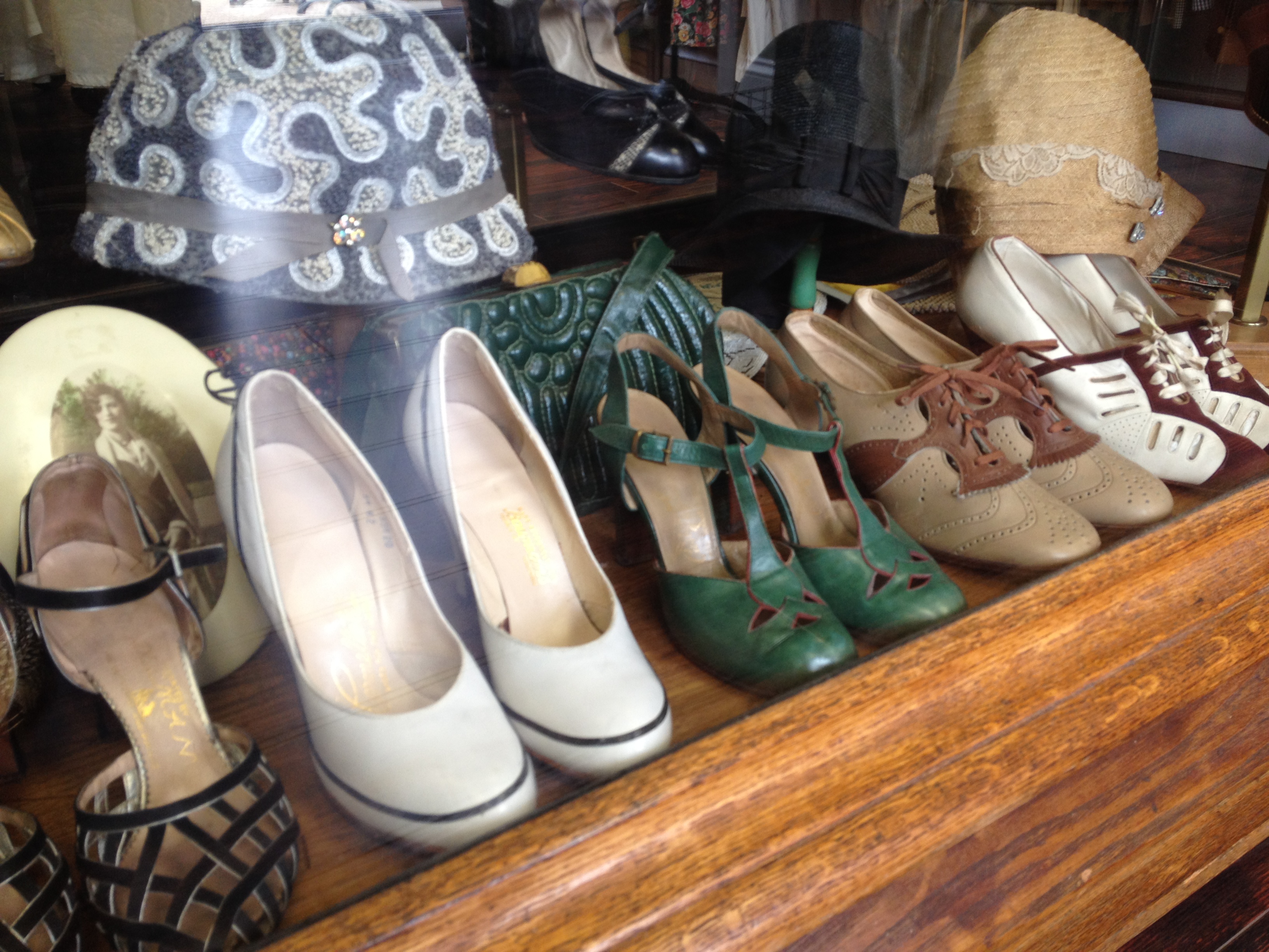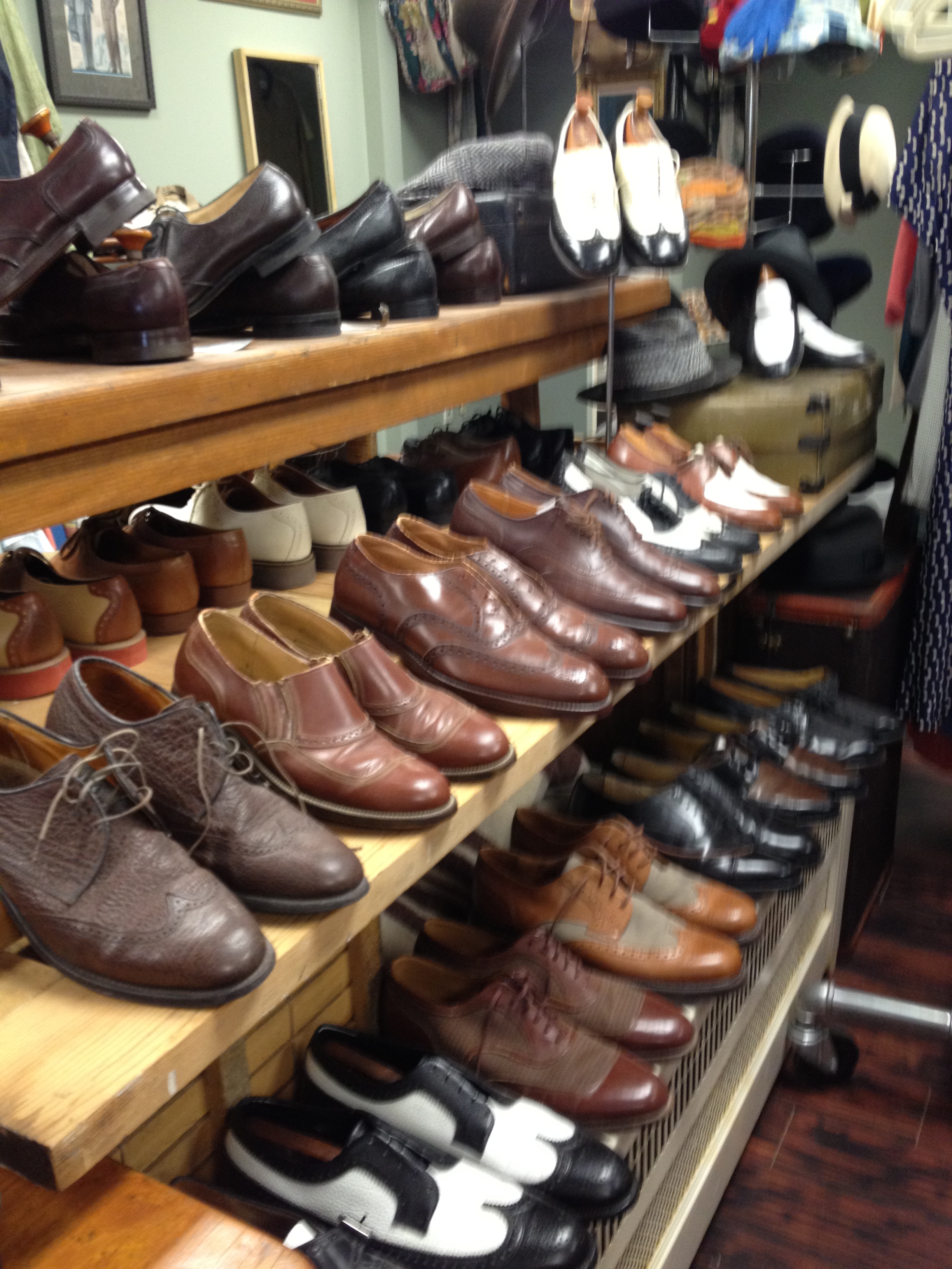 It took us three hours to get through everything in the store and try on the rack of clothes that Beth and I accumulated through our collective digging through the store. The store itself is small is square footage, but packed with everything good – there was no small rack where the few swing era items were delegated – the entire store was pre-1960’s, so 100% of their inventory was everything that you would want to see in a vintage store. It was glorious! The men’s section rivaled the women’s section in size and magnificence (who has an entire rack devoted to two tone Ricky Ricardo jackets?) and a men’s shoe section that took up an entire table, and included children’s shoes (tiny leather and mesh oxfords!). Owner Shelley White took us through boxes in the back room filled with delicate 1920’s beaded dresses, there were racks of glorious dresses and gowns, plus some very practical items that would be perfect for dancing. The women’s shoes had a good selection of larger women’s sizes, which was great for Beth, who picked up a pair of fantastic 1940’s heels.