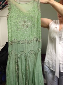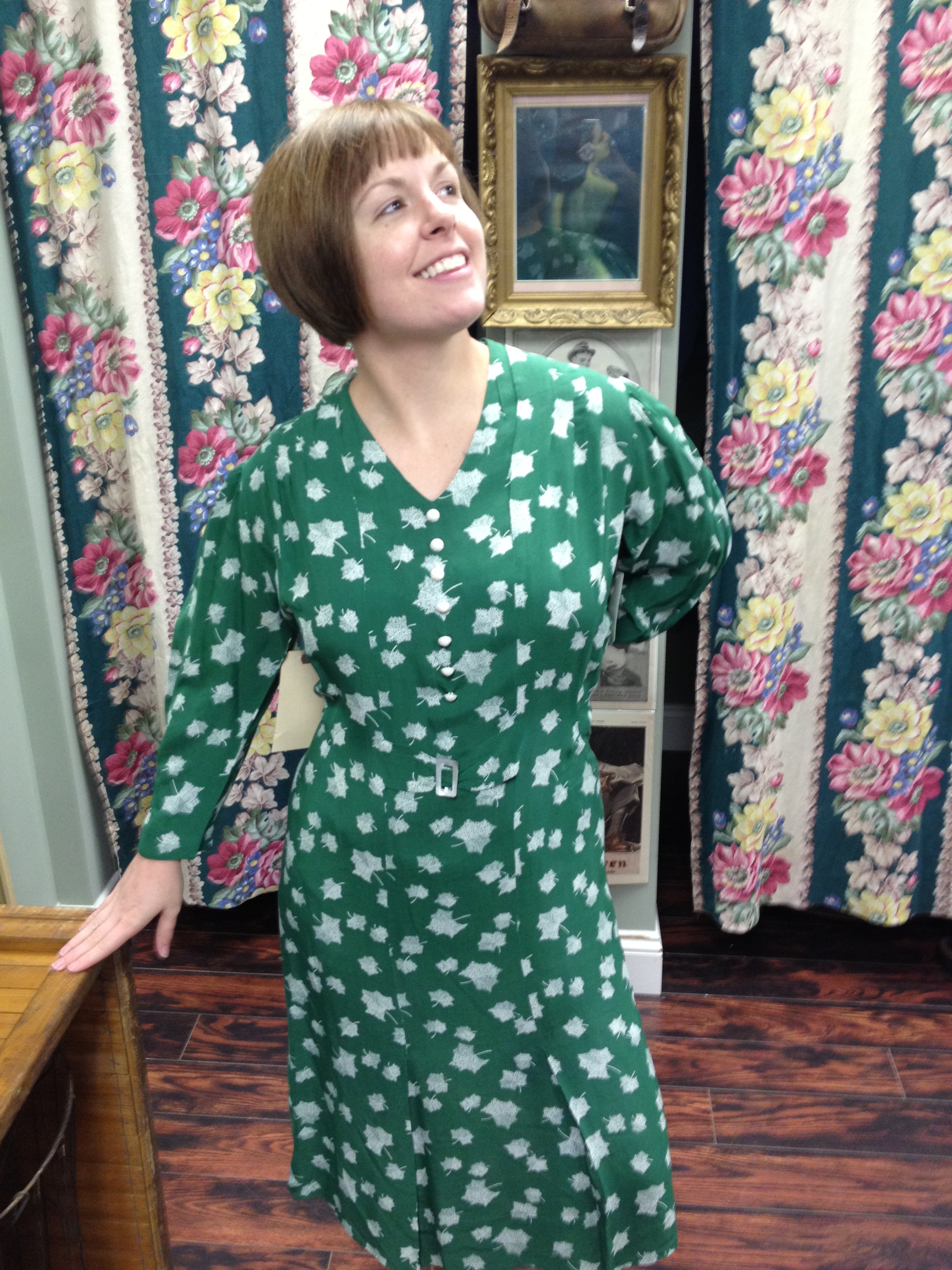 My find of the day – a 1930’s day dress in green. I’m holding the back because it will have to be taken in a bit, but I can’t pass up a green 30’s dress…