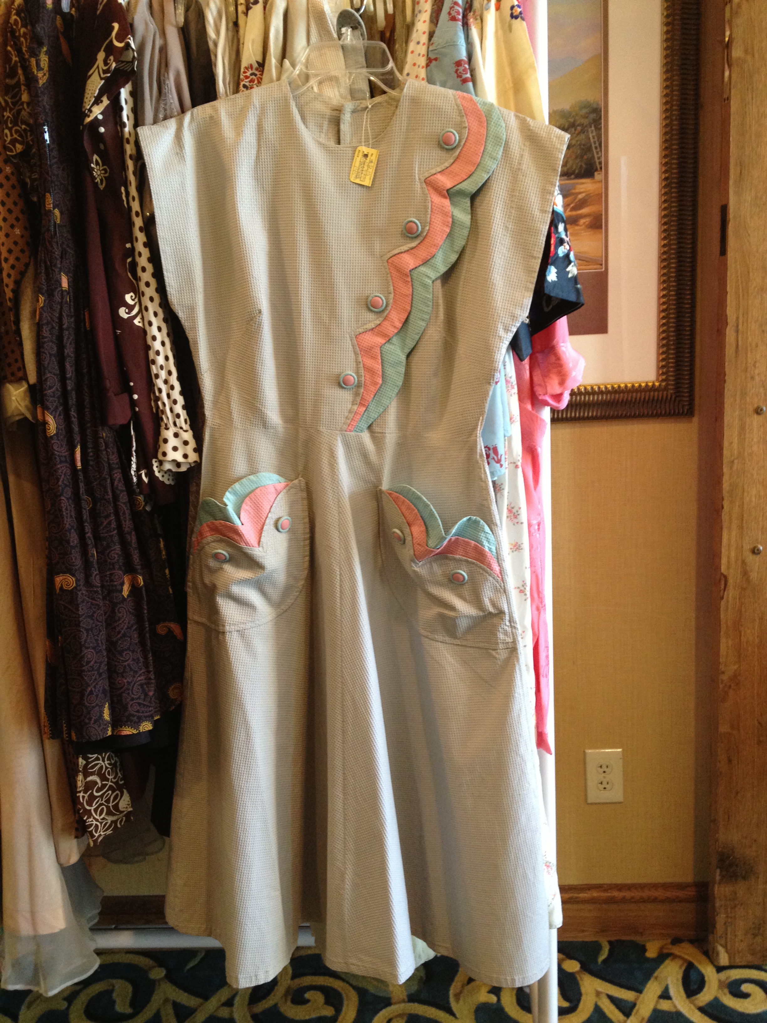 Love this green 50’s dress, with a white scalloped stripe across the upper torso to draw the eye up and GIANT POCKETS.