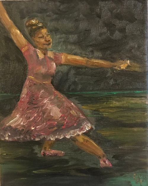 Emily Ensign’s “Swing Follow Pink Dress” oil painting pays tribute to the roots of Lindy Hop with a nod to Degas’ ballerinas