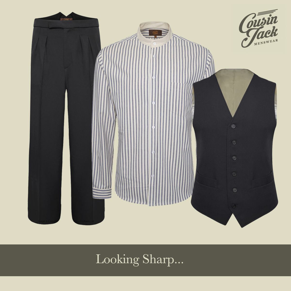 I don’t know what is going on in the UK, but they are acing the vintage reproduction market in almost all ways. Enter Cousin Jack Menswear, adding to the ranks of promising vintage offerings and showing the practical side of looking good. For example, pictured on the main page of their website is a pair of trousers with a fishtail back, espousing that said trousers “can be worn for cycling, jogging, fishing, hop skotch [but not scotch? I’ll defer, LOL], or even turning up a new spindle for that staircase.” While I don’t believe anyone is going to run a 10K in these trousers, I do like the idea that if you needed to break into a trot to chase a pet or maybe spend a couple of hours swinging out, that you would be secure in the breathability and range of motion of said trousers.