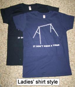 The shirts are available in unisex sizes, S to XL in black and navy blue, and a few black XXL. The ladies shirts are available in S to XL in black and navy blue. $15.00 a pop ($17.50 for XXL) plus shipping.