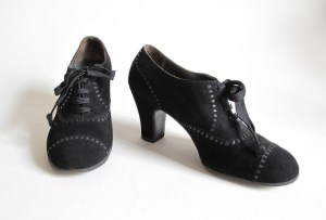 Black is a staple color and I’m sure most of you have a pair of basic black dance shoes, but there was something about this particular pair of black oxfords, offered by Etsy seller Raleigh Vintage, that caught my eye and made me wish I could make this pair mine. They have a graceful shape and this lovely “stitched” detail throughout, which gives the appearance of either large stitches or a thread of ribbon running through cutouts in the shoe. At a size 6, they are small, but not so narrow, as the shoe width comes in at 3 inches.
