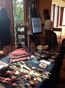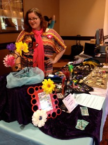 Finally, on the other end of vendor’s row was MA’s Mad House of Adornment, another Etsy vendor with great feathered headpieces and eclectic jewelry. I am particularly fond of feathered headpieces made from feathers with curled ends – the effect is really stunning and the result is that they tend to lay so nicely in whatever configuration I have seen them in. I was also amused by the Scarlett O’Hara necklace – the movie came out in 1939, so we’ll humor the reference.