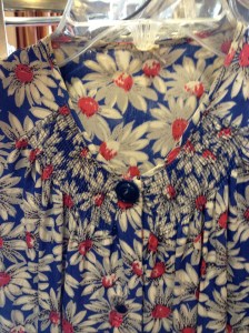 Usually, one of Sharon’s creations begins with a piece of jewelry…Ms. Crawford and her workstationOne of the books on vintage makeup at The Cleveland Shop’s tableI love the smocking on this dress from The Cleveland ShopPlaid!My GAWD the shoes – at Raleigh VintageRaleigh Vintage’s table of gentlemanly accoutrementsThe jewelry case at Raleigh Vintage’s ladies’ tableThis dead stock tie came with a matching pocket square!Beautiful beading on this 1940’s dressI do love a Peter Pan collar – at Raleigh VintageI REALLY wanted this dress, and it really didn’t have a zipper, snaps, or any way to get into the dress other than over the head – someone smaller than me should come crawl in and enjoy. 🙂Another lovely green item, this time for the gents, from Raleigh Vintage.Dress with matching necklace – how often does that happen? At Raleigh Vintage.