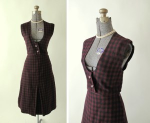 The styling on this is adorable – the little hat, the belt, the pixie haircut… I also love the bows down the front, and the subtle detail that the plaids are symmetrical from the back of the dress, both horizontal and on the diagonal (you’ll have to click on the link to see the back, I couldn’t get the photo off the auction page), which makes this dress a really cool piece of clothing.