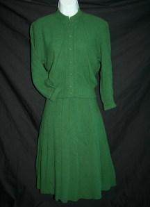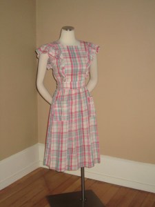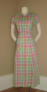 Two tone gray and yellow dress with Peter Pan collar and contrast trim on giant pockets = LOVEPlaid pinafore dress with sash, ruffle sleeves, and buttons down the backRayon dress in a lovely shade of greenThis is technically separates, but this green cardigan and swing skirt with lots of goring were meant to be together! Why is all the green stuff not in my size? 😦Gorgeous rayon print dress with blue sashRed gingham dress with white contrast color and pocket detailCoral print dress with contrast collar and cuffs and double buttons down the frontCandy colored plaid dress with a single giant pocket