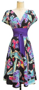 It seems that every clothing source I obsess over is doing something wonderful this week – Leluxe samples, 70% off at Mod Cloth, and – to put the cherry on my week-long clothing smorgasbord sundae – Trashy Diva has posted new dresses and some reissues of some of my favorite dresses, all in period-perfect, dance-perfect rayon prints. The pièce de résistance is one of their new fabrics, a charming fan print in Mardi Gras colors!