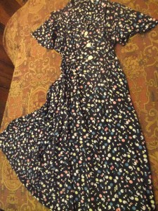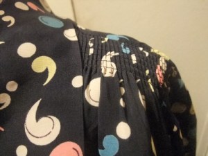 I was scanning through my eBay search emails today and came across a listing for this 1940’s rayon print dress that showed a detailed photograph of the fabric and a button, rather than a photograph of the entire dress. Some sellers choose to do this, but don’t always capture the detail in a way that is compelling, the way the a photograph of the entire dress would. This listing, however, caught my eye because of this fantastic punctuation-themed print and the butter-colored buttons with metallic trim. On closer inspection, there were even more details in the dress, like smocking at the shoulders and what looks like smocking on the bodice just above the skirt. This seller, mir.a, is smart because just looking at the dress by itself, at a distance, it appears nondescript on its own and somewhat shapeless without a model – but showing off the dress’s fantastic details is enough for me to give this dress a further look (to discover it’s not in my size). Laid flat, measurements are 38 waist, 43 bust, free hips.