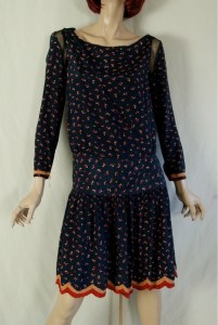Cherry prints are very popular for reproductions and can be found in vintage clothing every so often, but are usually associated with decades other than the 1920’s. Aside from the adorable print, this dress has some nice details, like mesh insets in around the arm holes, long sleeves with gold trim at the cuffs, and an adorable gold and red scalloped trim around the bottom of the dress that runs up the back of the skirt. Just fantastic!