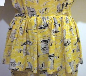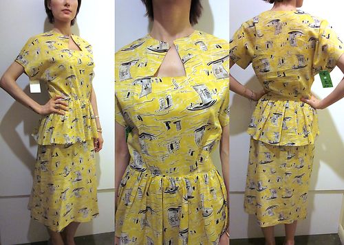 I am still on a peplum kick and fell in love with this 1940’s Asian novelty print dress with a lovely peplum. The combination of the cheerful color, the shape, that amazing cutout at the neckline, and this whimsical Asian print featuring little boats makes this dress. The only drawback is that this dress is from a NYC seller, which means it has a NYC price tag. Still…pretty fabulous. Perhaps a tongue-in-cheek wardrobe selection for the upcoming Eastern Balboa Championships?