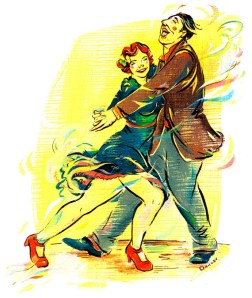 Lindy Hopper Jacqui Oakley is a dancer, instructor, and illustrator from Toronto, who has created several Lindy Hop-inspired illustrations and offers prints of her vivacious and colorful originals on her Etsy site. At $35.00 a pop, one of these prints would make a fantastic gift for your favorite Lindy Hopper, or treat yourself to one of these cheerful prints. The illustrations remind me of old comic book illustrations, the Dick and Jane books, a little bit of Disney circa All the Cat’s Join In, and photographs of Bobby White and Kate Hedin.