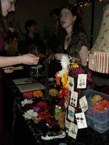 Revive Fashions made, I believe, its debut this year at Lindy Focus, with the crafty Zoe Lechucita creating “custom made hair pieces, feather corsages, and tie pins” on site, while you wait or while you dance and come back to check on it later. 🙂  It was so great to see Zoe picking up the custom torch from Sharon Crawford, ensuring that you can have something custom made to match your ensemble for New Year’s Eve.