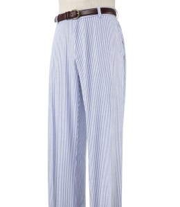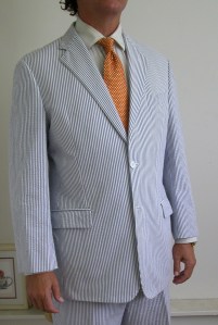 I do love a man in seersucker – there is something so refreshing about abandoning the typical dark male color scheme in favor of bright white, a touch of color, and some usually bright male accessories. It is such a stark contrast that I am afraid it has been relegated to dandies, preppy frat guys, and Southern lawyers (in my experience – if you go to the courthouse in July, you will be in the minority if you are not wearing seersucker, at least in my jurisdiction!) – which is a shame, because it’s a really versatile fabric.