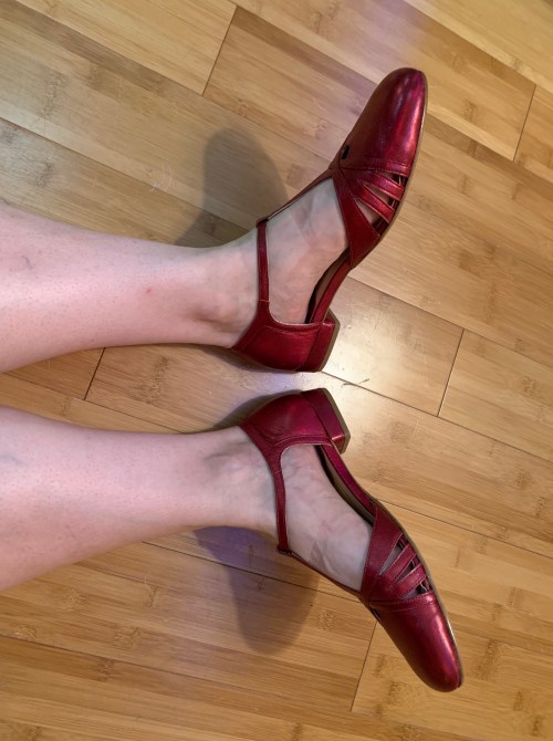 Finally, the shoes! On the heels of discussing my Dorothy complex in September’s post on Kitschy Witch, I was delighted to see that the red shoes I was anticipating were actually a delicious, shimmery ruby color. I may have died a small death of joy in receiving these shoes, the reveal was everything. The leather is soft, but not so soft that it doesn’t hold its shape. I can see these molding to my feet in good ways after several wears, and with the placement of the stitching and perforations I also anticipate that they will give in the right places and also hold up in those places.