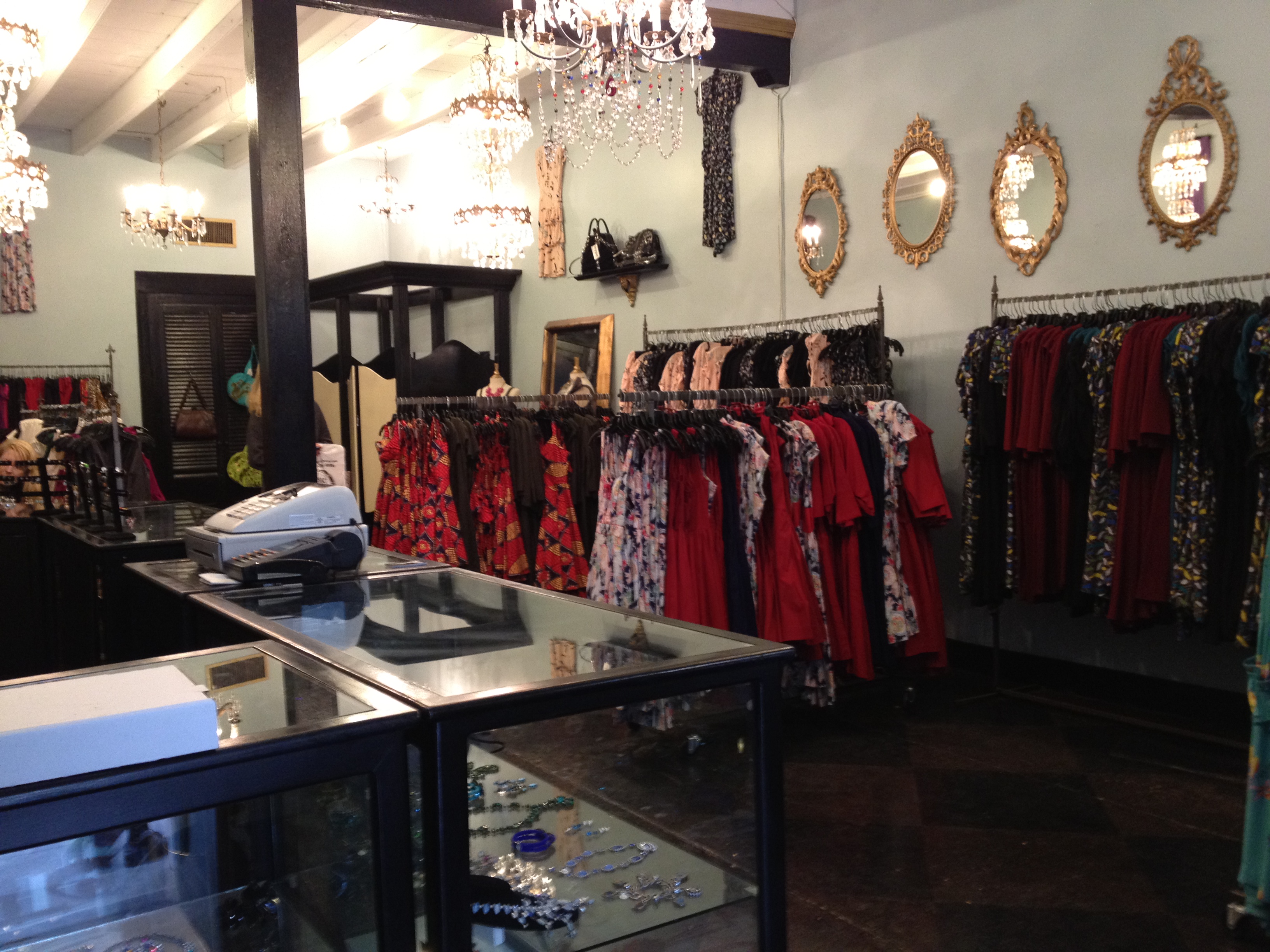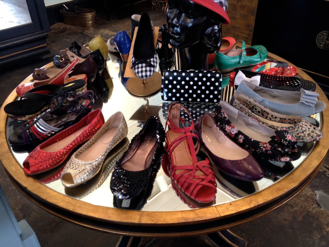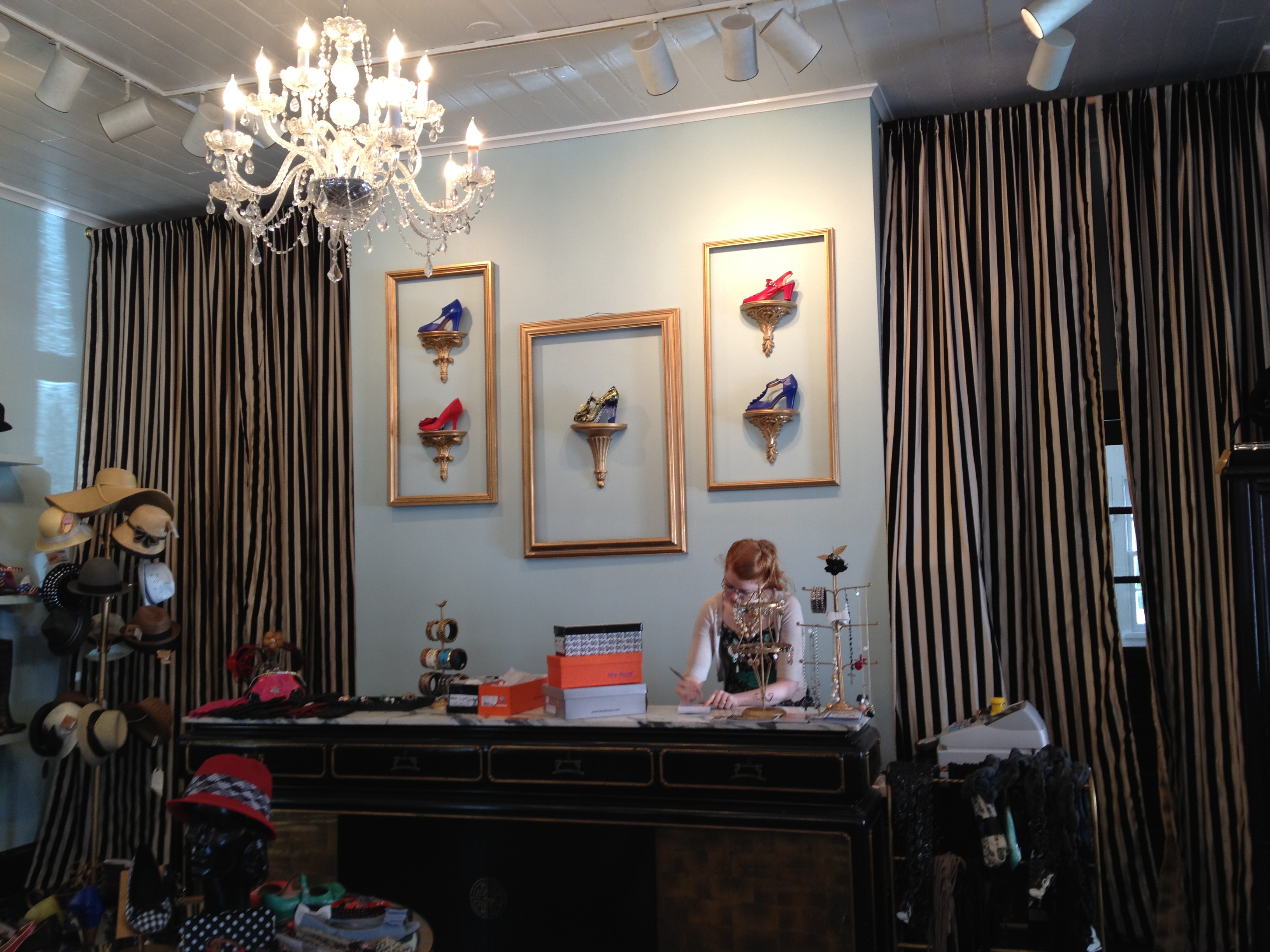 The view of the dress shop from the door - instant meltdown.Knit dresses greet you at the door, with fantastic necklacesLovely pink and gray - dress from the new bridal collectionThe beaded detail on the silk Sadie dressThe jewelry counter, with fantastic fakeliteAdorable flats!Rachel and the domain of delectable shoesA functional use of mantel space 🙂