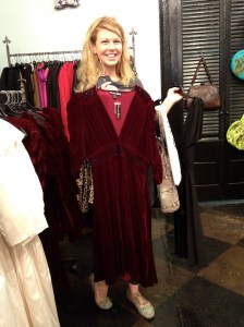 I’m pretty adventurous about buying clothing online, but it was so nice to be able to try on the dresses in the store. Candice Gwinn‘s designs are even more fetching in person. We all leaped in with gusto, each of us hitting either the jewelry counter, the dressing room, or both to take in all the wonderful things we spotted that wanted to come home with us. Danielle left with the dress of the day, the gorgeous deep red velvet Natasha dress, with beading at the shoulders and all around the waistband. The photo on the website doesn’t begin to do this gorgeous dress justice – it’s simply to die for – and it’s perfect for a Christmas or New Year’s Eve cocktail party or a winter dance opportunity.