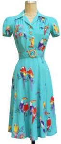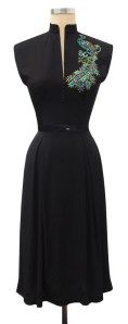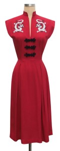 I often wonder what inspired certain reproduction dresses – shapes and motifs are obvious, but what about the specifics? I love finding those rare inspiration pieces and found what I believe to be Trashy Diva’s inspiration for their fall collection Lilian Dress (which I immediately began panting over upon seeing it) – this wonderful 1940’s dress on eBay. The embroidery is spot on. While the dress has undergone some Trashy Diva modifications, I think they made some great choices like moving the embroidery closer to the shoulder, changing the embroidery colors to more peacock blues and greens, losing the hip seaming/detail, and giving it an overall sleeker, more Asian-inspired silhouette. The charm is not lost, though, as the embroidery in the original is just as magnificent as the repro, and that little row of buttons is divine on both.