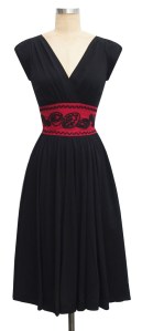 With “the bodice and sleeves…modeled after a 1937 vintage pattern,” the two tone Frenchie Dress is adorable, sexy, eye-catching, and actually looks really comfortable. Not to be overlooked are the wonderful vintage-inspired frog closures at the waist. The overall effect is slimming, with red drawing your eye in and the black slimming you from the sides.